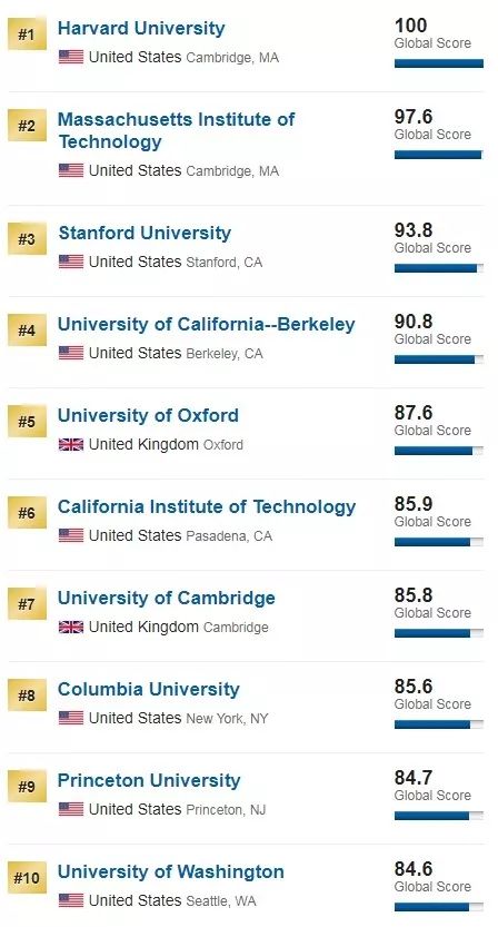 USNews 2019世界大学排行榜中,美国高校占据绝对优势。哈佛大学、麻省理工学院和斯坦福大学依然位居前三位,和去年保持一致。加州大学伯克利分校,牛津大学,加州理工学院,剑桥大学,哥伦比亚大学,普林斯顿大学和华盛顿大学进入TOP10榜单。