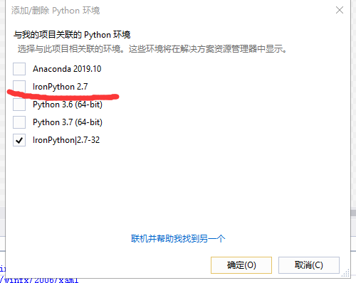 解决思路:重新添加IronPython环境,注意红笔勾出来个环境。在你的系统中是没有的,我是在VS2017的python 环境菜单中自定义的一个。关键步骤有两个一个是去官网下载IRON python安装包。另外就是在自定义中选择路径,将环境配置完成后,按自动识别。再次进入资源管理器就能获得这个选项,仅需要选择中他。