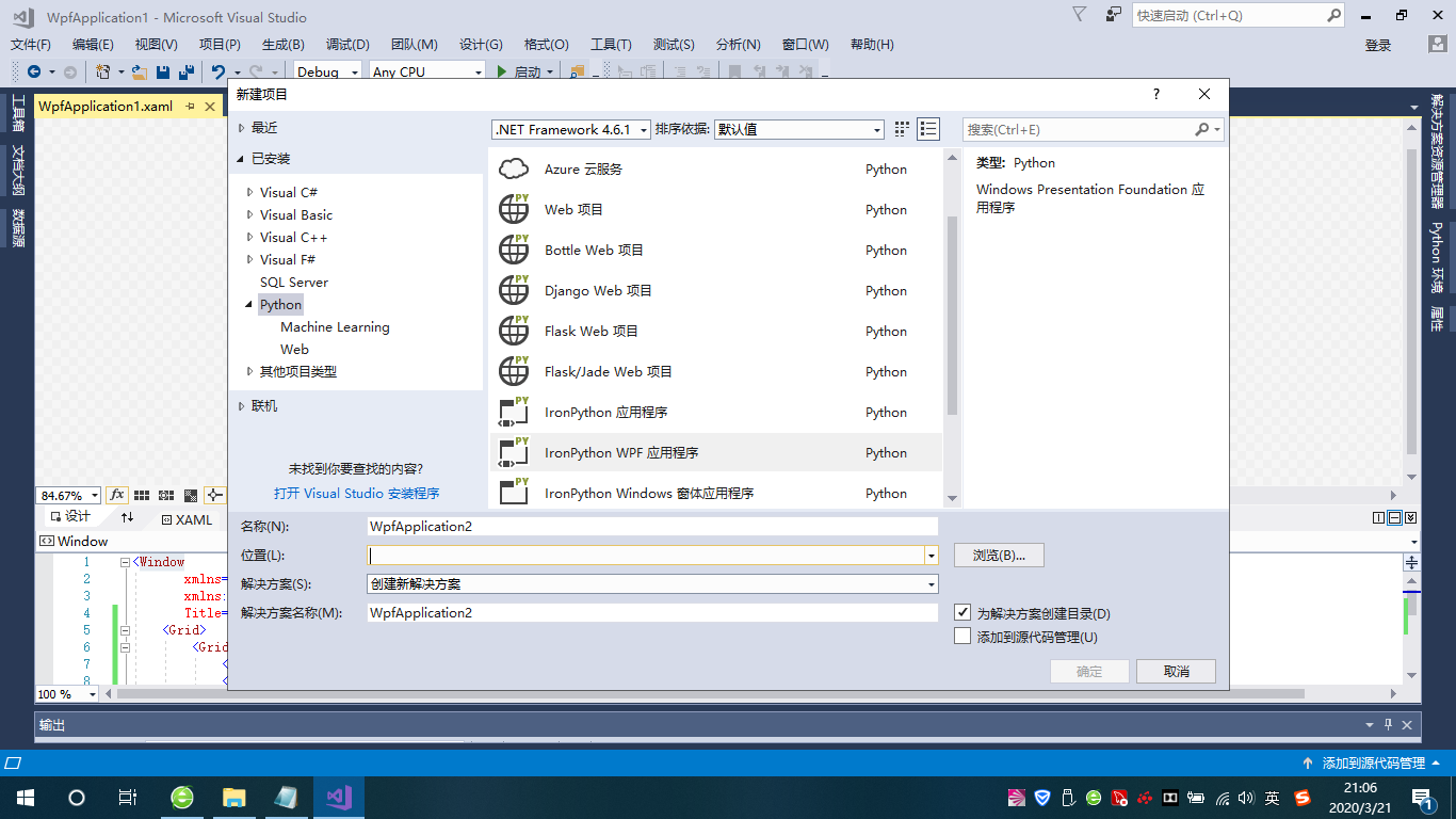 说干就干,运行VS2017,打算建一个IronPython WPF 应用项目,来学习一下IronPython和WPF。本以为很简单,哪知道还是有几个浅坑。