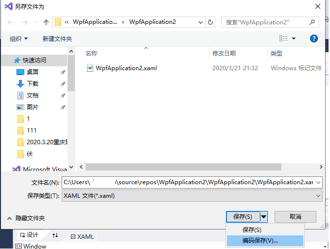解决思路:在网上找了很久,在一个网友的提问中,找到了答案。将XAML文件另存为一次,注意要选择编码保存。随后,会弹出一个框,选择UTF8格式即可。