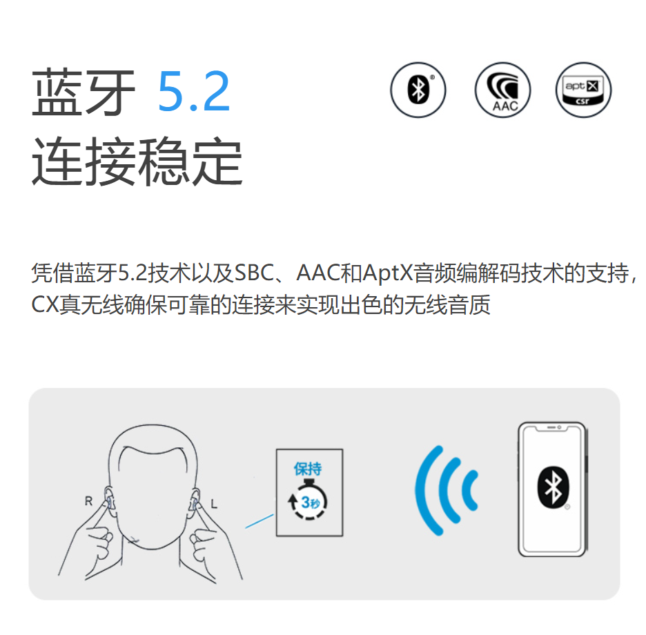 这款耳机凭借蓝牙 5.2 技术,支持 SBC、AAC、aptX 音频解码标准,左右耳单独传输。每只耳机均搭载两个麦克风,采用波束成形方式拾取声音,但不支持主动降噪。