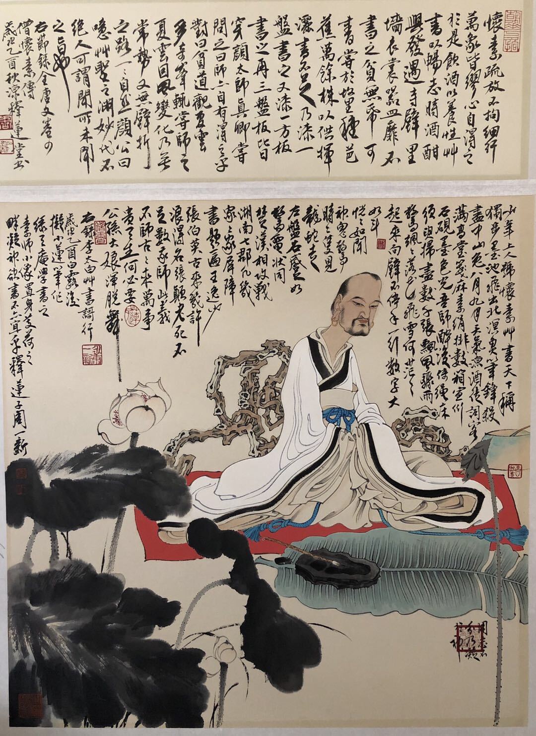 《怀素》是一新先生代表作,该幅作品的亮点并非笔墨纸砚、莲花、芭蕉的人文情趣,而是潇洒自由的泼墨写意。因为、芭蕉、莲花和文人案头的熏香等在陈老莲的人物画作品中常见,但泼墨写意荷花不多见。即使在任伯年的作品中也很少出现。而且,该幅作品中用了独具特色的浓墨、泼墨、积墨法,实属难得。