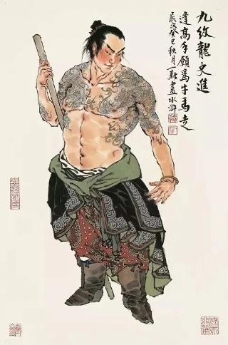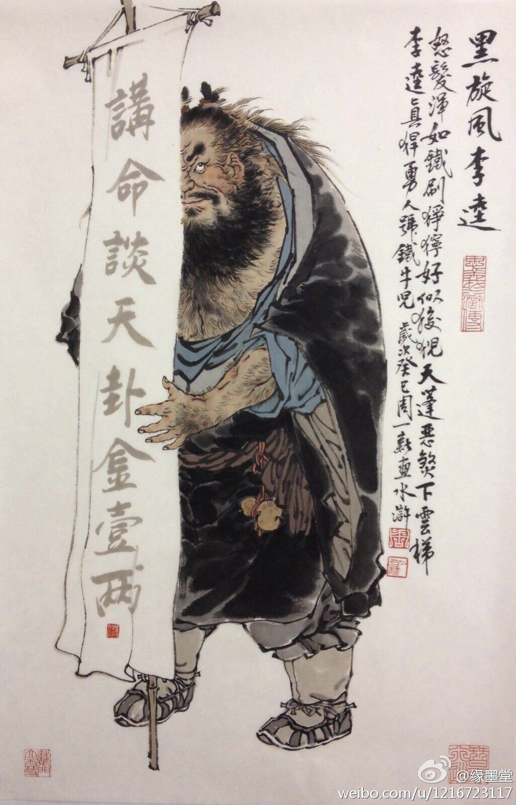 真正将水浒人物作成水墨画的当代周一新具有开创性。他取法陈老莲、戴敦邦诸家法,参以个人心法,将水浒文学中的108个人物有笔有墨的表现了出来。将他的水浒人物与陈老莲的白描《水浒叶子》对比,便会发现周先生已经在前人的基础上开创了自己的水浒人物面目与画法。其气场更大、笔墨更丰富。