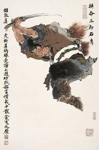 晚晴至今画家的英雄主义书写情趣可直接追溯至陈老莲处。陈的《水浒叶子》、《九歌图》当视为人物画借古喻今的启蒙之作。实际上,近代以来的人物画史,包括周一新先生人物画的最大魅力正是将英雄主义、侠义公案文学中关公、钟馗、水浒等人物融进绘画,并成了激发民族凝聚力、荣誉感,增强知识分子爱国、敢于担当的经典素材。真正意义上,人物画在表现英雄主义、侠义公案题材方面,经历过抗战文艺、革命文艺的老一辈艺术家书写了一个历史传统和高度。专门以人物画名世的画家徐悲鸿、蒋兆和、黄胄、周思聪,都在写历史典故、塑造当下英雄人物笔墨中,创作出了不朽的经典作品。山水、花鸟画家也顺应潮流,傅抱石、关山月、陆俨少、钱松岩等在描写革命英雄人物事迹、大场面生产场景中也发挥了作用,其作品被人称颂。花鸟画家如潘天寿、李苦禅的鹰,有人的智识情怀和范仲淹式的担当忧患。可以说,整个百年画史,英雄主义情结贯彻其中。只是,人物画比山水、花鸟、动物画表现得更为直接。