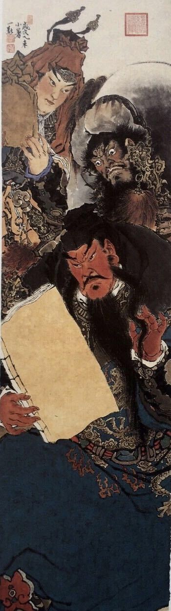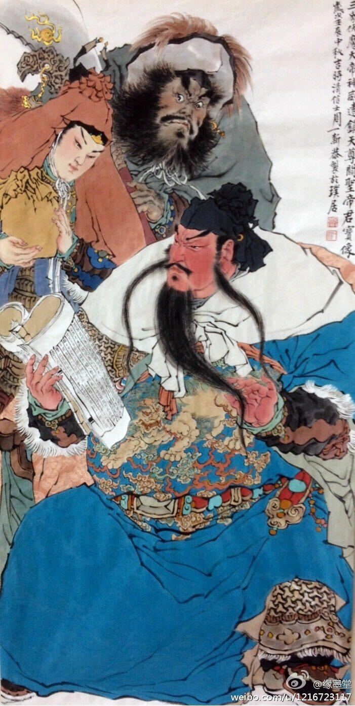 丁云鹏之关公,和颜悦色、慈眉善目、威严肃穆的仪态,严格恪守了儒学标准。任伯年之关公(见《关公读书图》纸本设色246.5cm×122cm ,1888年 沈阳故宫博物院藏),则将这种标准更真实化。具体手法上,弱化了关公之武气,强化了文气,给关公塑造了一个文弱的、清瘦的、仙风道骨的智谋形象。