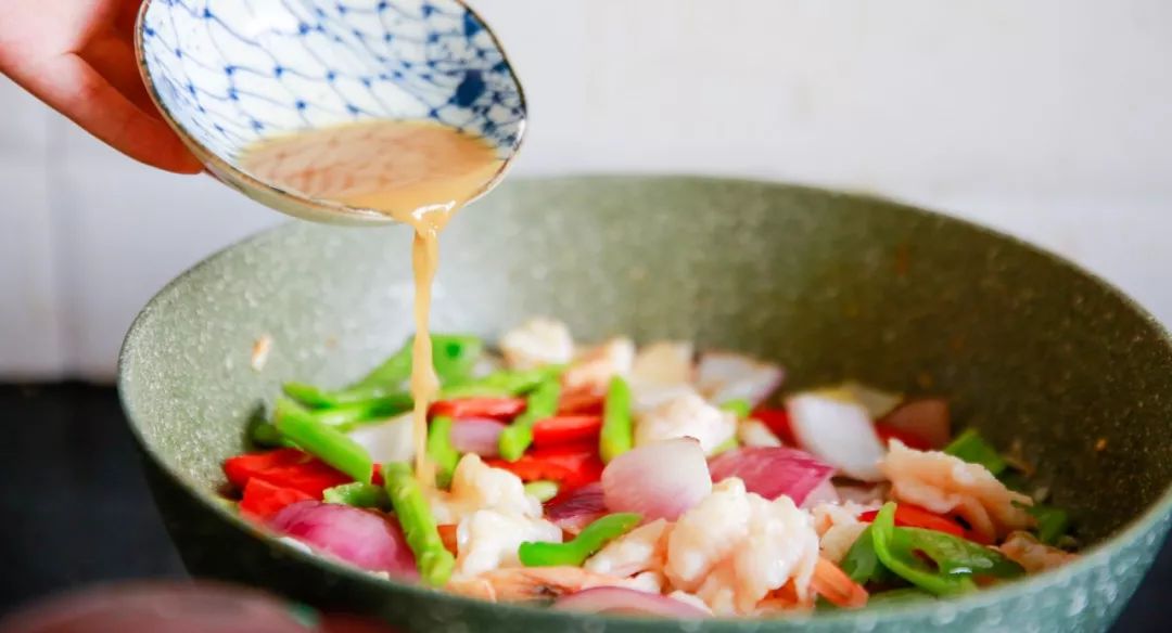 最后淋上调好的酱汁,转大火,翻炒均匀就可以出锅了。