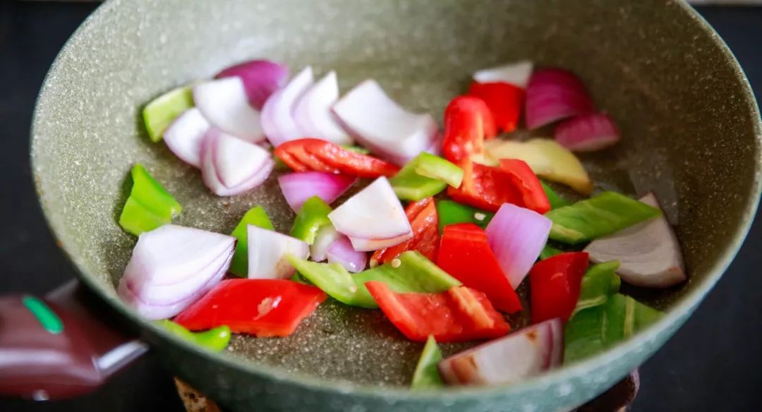 ▼ 5.炒菜:锅中倒入少许食用油,开中火,油温升高后,先下入洋葱、青红椒炒出香味。