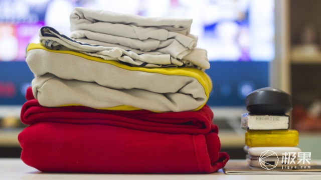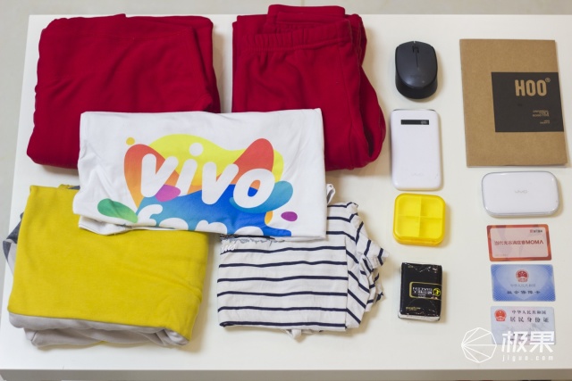 在口袋收纳后,其余的空间可以让我们来存放其他的大件物品,我这边准备了一些物品来放置:保暖内衣两件套(超厚的)、两件短袖T恤、一件长袖运动衫、鼠标*1、移动电源*2、药盒*1、卡片*3、纸巾*1、笔记本(纸质)*1,大概就是这些了。▼