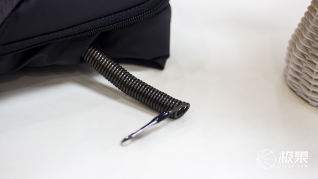 伸缩钢缆隐藏在背包肩带一侧,为隐藏式设计,日常不适用时,可以隐藏在背包内。▼