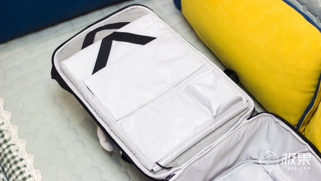外部收纳介绍完毕,再看看内部结构吧,背包拉链可以180°开口,方便我们整理存放物品,这点与行李箱类似,可以说是非常方便。▼