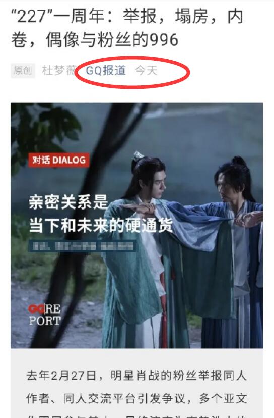 3月2日, GQ报道发布了一篇名为《“227”一周年:举报,塌房,内卷,偶像与粉丝的996》的文章。随后,GQ疑似被肖战粉丝骂上热搜。