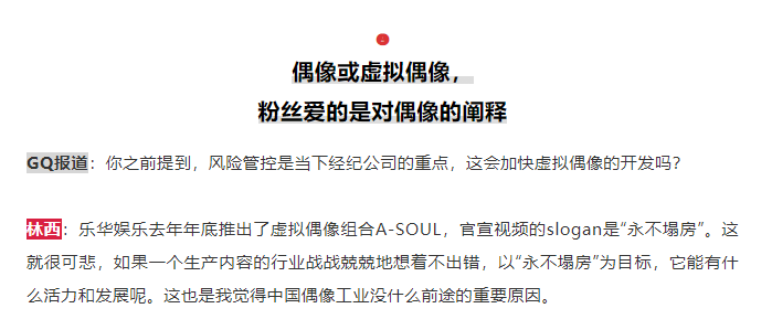 不难发现,从内容上看,在227事件发生一周年后,GQ站在了行业观察者的角度,试图从粉丝行为和饭圈现象来解读当下的流行文化,包括举报滥用、“塌房元年”、性别议题、虚拟偶像等,同时探讨了偶像工业的过去的变迁和未来的可能;涉及到肖战和227的部分多集中于开头引言。