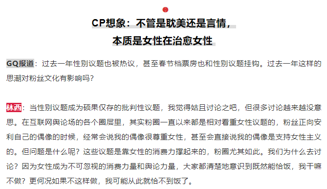 随后,文章探讨了当下极具热度的性别议题,认为粉丝对于“CP想象”的建构,不管是耽美还是言情,本质上都是女性在治愈女性。