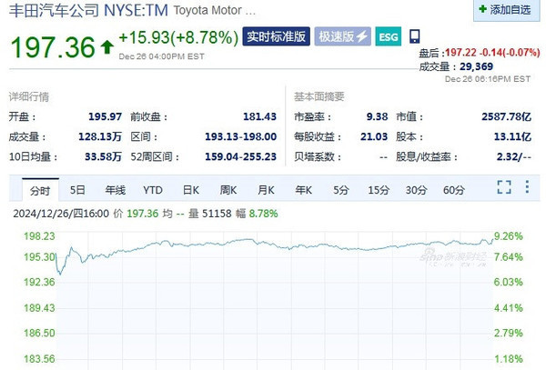 当地时间12月26日美股收盘,丰田汽车股价大涨8.78%,市值一夜大增209亿美元(约合人民币1525亿元)总市值来到了2587.78亿美元(约合1.89万亿人民币)。消息面上,有报道称,这家日本汽车制造商计划将其净资产收益率(ROE)提高一倍至20%。这一目标不仅远超日本上市企业平均9%左右的水平,在全球大型车企中也堪称顶尖。尽管丰田未透露实现这一目标的具体时间,但市场普遍预计其将在2030年前后达成。