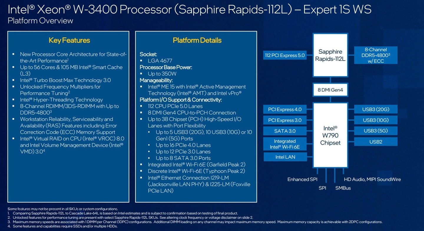 IT之家了解到,英特尔主流级 W-2400 系列至强处理器包括 W3 到 W7 型号,6 核到 24 核,三级缓存最高 45MB,频率可达 4.8GHz,拥有 64 条 CPU PCIe 5.0 通道,支持最高 2TB 4 通道 DDR5-4800 内存,功耗可达 225W。至强 W-3400 系列包括 W5 到 W9 型号,12 核到 56 核,三级缓存最高 105MB,频率可达 4.8GHz,拥有 112 条 CPU PCIe 5.0 通道,支持最高 4TB 8 通道 DDR5-4800 内存,功耗可达 350W。