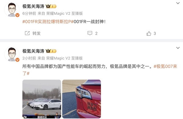在最后的一组测试中,亮相的是极氪001 FR和特斯拉Model S Plaid,测试过程中特斯拉Model S Plaid轮胎发生冒烟情况退出比赛,极氪001 FR则独自不断刷新最快成绩,最终跑出了2.63秒的成绩,成为了今天加速最快的车型。在测试之后,极氪CMO关海涛也发文表示“所有中国品牌都为国产性能车的崛起而努力,极氪品牌是其中之一”。极氪001 FR实测拉爆特斯拉S Plaid,001FR一战封神。
