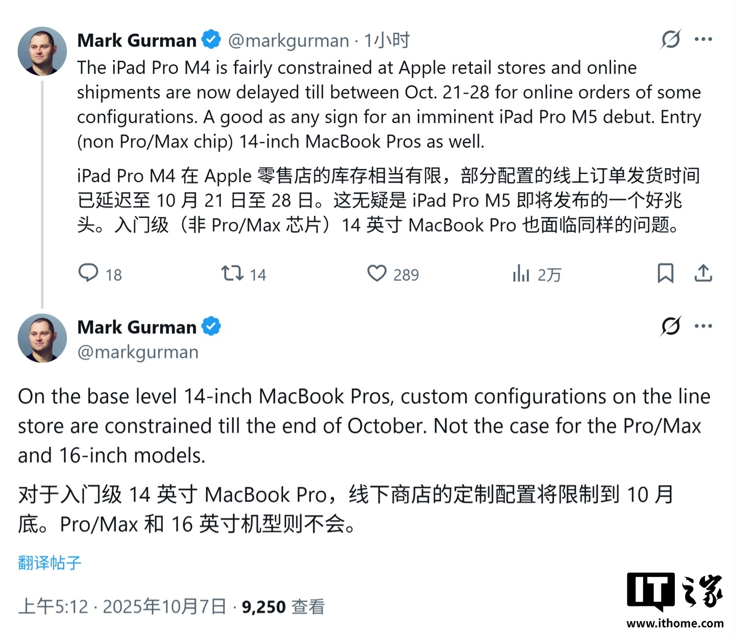 与此同时,M4 MacBook Pro 产品线也出现了类似迹象,虽然 Pro / Max 和 16 英寸型号供应充足,但基础款 14 英寸型号的定制配置订单已积压,发货时间被推迟至十月底。