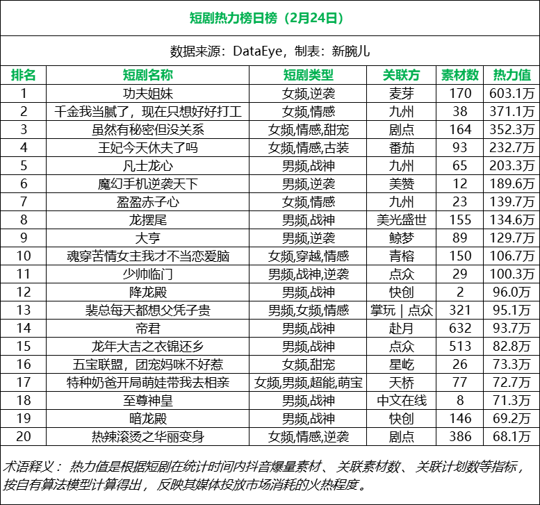 编者按:为帮助从业者提供更多信息,专注于短剧报道的新腕儿和科技媒体鞭牛士联合DataEye共同推出短剧消耗热力值日榜。