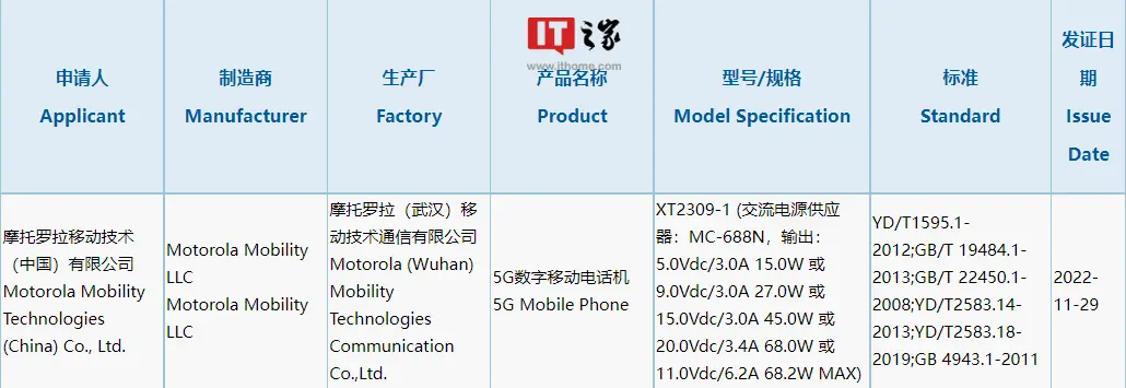 近日,这款爆料的新机已经通过了工信部 3C 认证,型号为 XT2309-1,配备 68W 充电器,是属于摩托罗拉的产品。