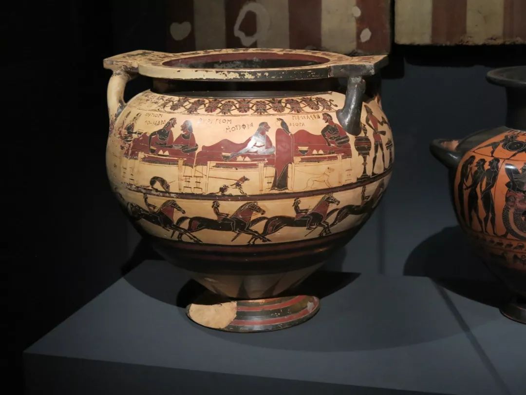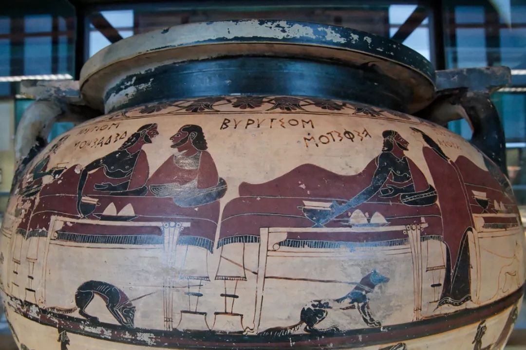 ▲ [古希腊] 黑绘人物陶瓶《国王欧律狄俄斯宴请赫拉克勒斯》,约公元前600年,高46 cm; 宽46.5 cm; 直径 28.2 cm