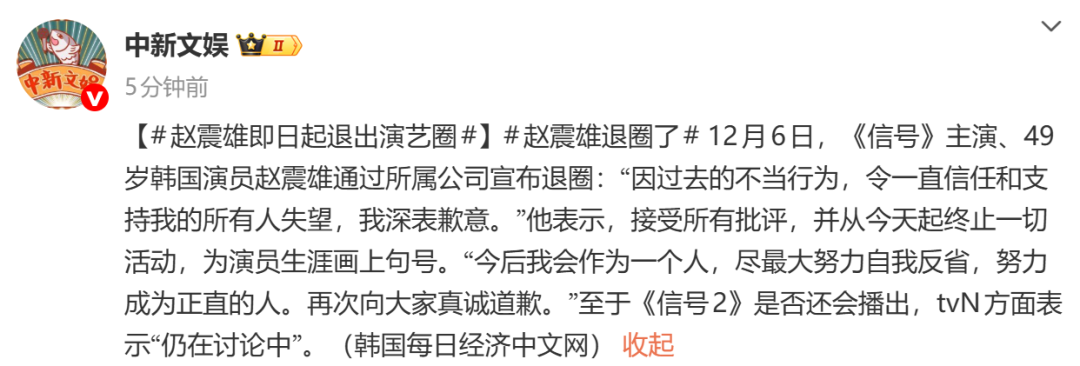 12月6日,据中新文娱,《信号》主演、49岁韩国演员赵震雄通过所属公司宣布退圈:“因过去的不当行为,令一直信任和支持我的所有人失望,我深表歉意。”他表示,接受所有批评,并从今天起终止一切活动,为演员生涯画上句号。“今后我会作为一个人,尽最大努力自我反省,努力成为正直的人。再次向大家真诚道歉。”