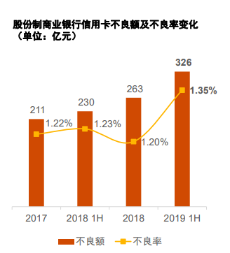 该报告进一步指出,股份制商业银行仍有压力,并特别提醒关注信用卡风险。截至2019年6月末,九家股份制商业银行不良率与逾期率持续下降,但不良率与逾期率的差距仍较大;上半年股份制商业银行加大了核销力度,核销的准备金规模为1,828亿元,较2018年同期增加29%,处置的力度有所加大;股份制商业银行的信用卡业务近几年呈现高速增长的趋势,随着业务规模的扩大,其资产质量风险在开始集中暴露。