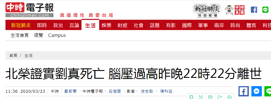 今天稍早,台湾“中时电子报”更新消息称,台北荣民总医院已证实刘真病逝消息。台北荣民总医院发声明表示,刘真于2020年2月7日至本院接受传统主动脉瓣膜置换手术。由于心脏功能恢复不良,先后置放叶克膜及右冠状动脉支架,后续因心脏功能迟未恢复,于2月13日装置心室辅助器,,2月下旬及3月初先后发生脑部栓塞与出血,造成脑压上升进行开颅减压手术。术后虽一度有起色,仍因为脑压过高,药石罔效,于3月22日晚上22时22分不幸辞世。