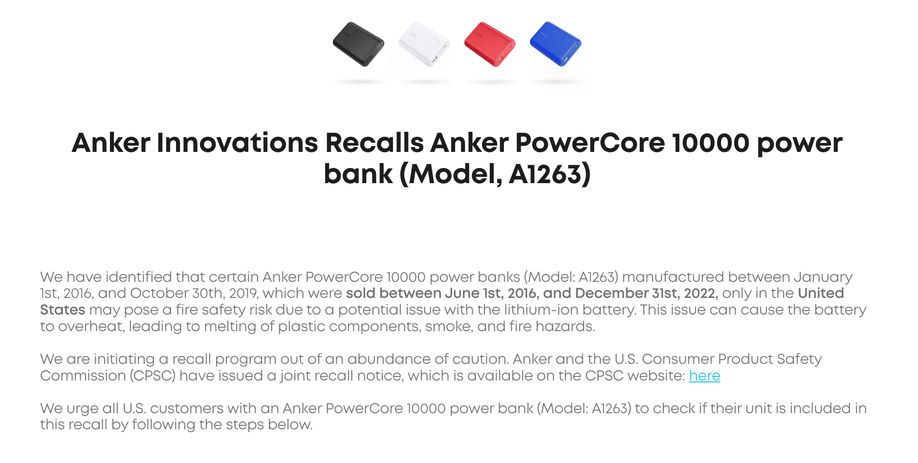 6月13日,安克创新在其美国官网发布公告称,发现2016年1月1日至2019年10月30日生产、2016年6月1日至2022年12月31日仅在美国销售的某些Anker PowerCore 10000移动电源(型号:A1263),可能因锂离子电池的潜在问题而存在火灾风险。该问题可能导致电池过热,从而导致塑料部件熔化、冒烟和火灾危险。出于谨慎考虑,安克创新启动了召回计划。