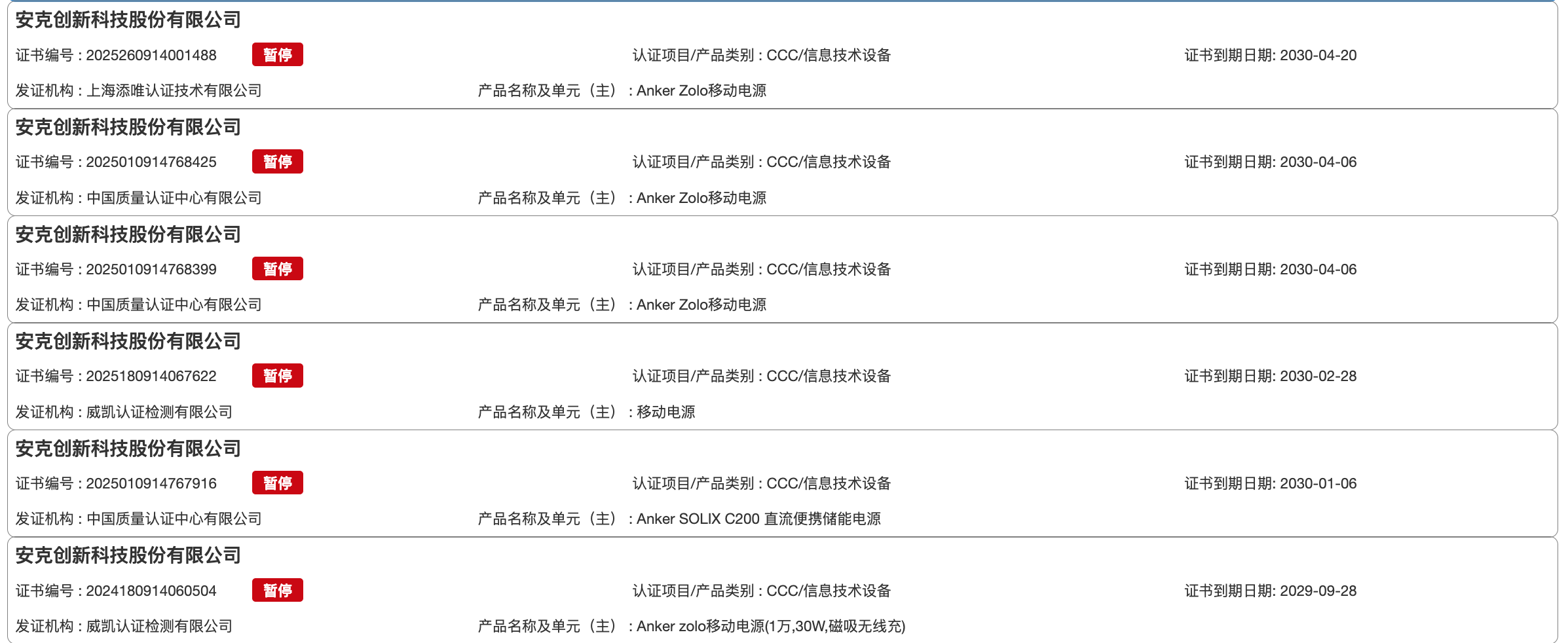 全国认证认可信息公共服务平台显示,近日,安克创新科技股份有限公司多款移动电源产品的3C认证证书被暂停。