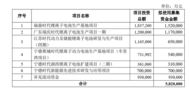 宁德时代此次拟将募资主要投向福鼎、广东、江苏、宁德等地的产能扩张项目,这部分项目合计募投金额约 419 亿元。此外,研发项目拟募投 70 亿元,补充流动资金拟募投 93 亿元。