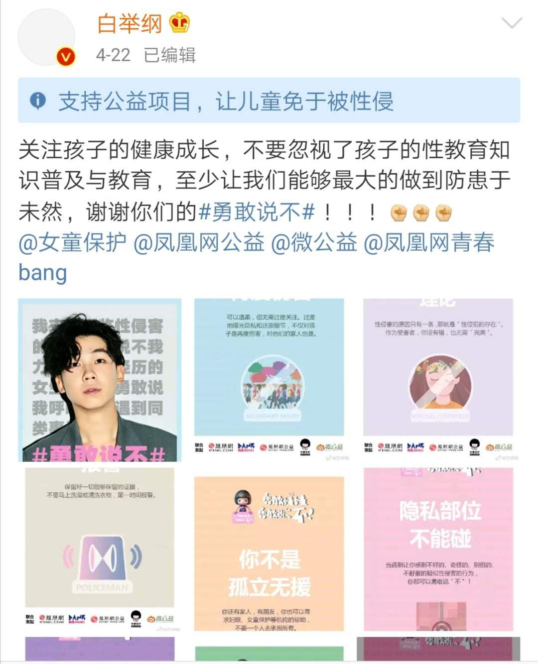 在4月14日,谢娜和女童保护基金联合发起话题#勇敢说不#后,4月22日,凤凰网公益、凤凰网青春BANG、女童保护基金和新浪微公益联合发起“勇敢娃娃,勇敢说不”公益倡导活动。