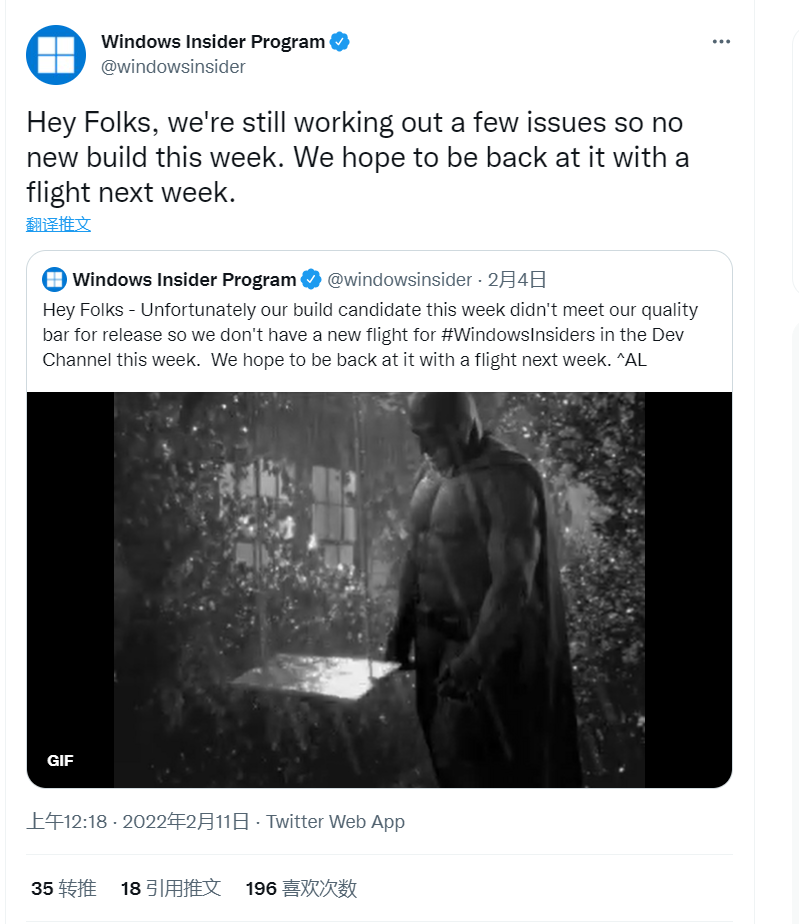 而今天(美国时间 2 月 10 日),微软再次称,嘿,伙计们,我们仍然在解决一些问题,所以本周没有新的版本。我们希望能在下周重新开始发布。