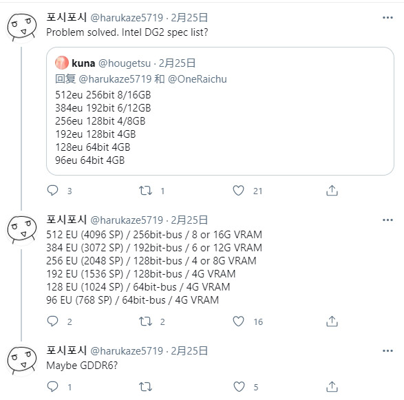 根据目前的消息,Xe-HPG游戏显卡是基于DG2的,推特用户@harukaze5719透露了Intel DG2的一系列规格,从他透露的消息来看,DG2至少有3种不同的GPU,最高规格的拥有512组EU,之后是384EU和128EU的版本,而每个GPU都有两种不同的变体。
