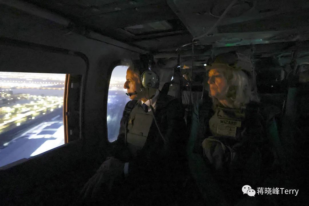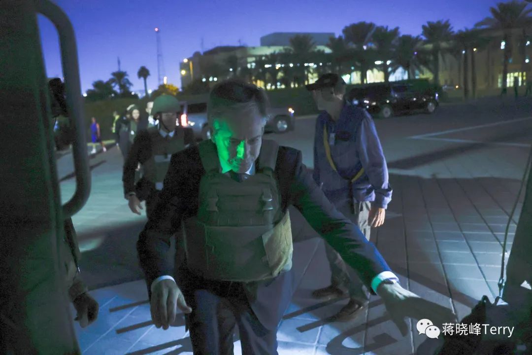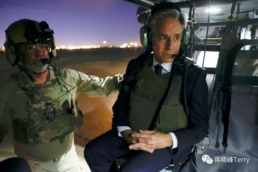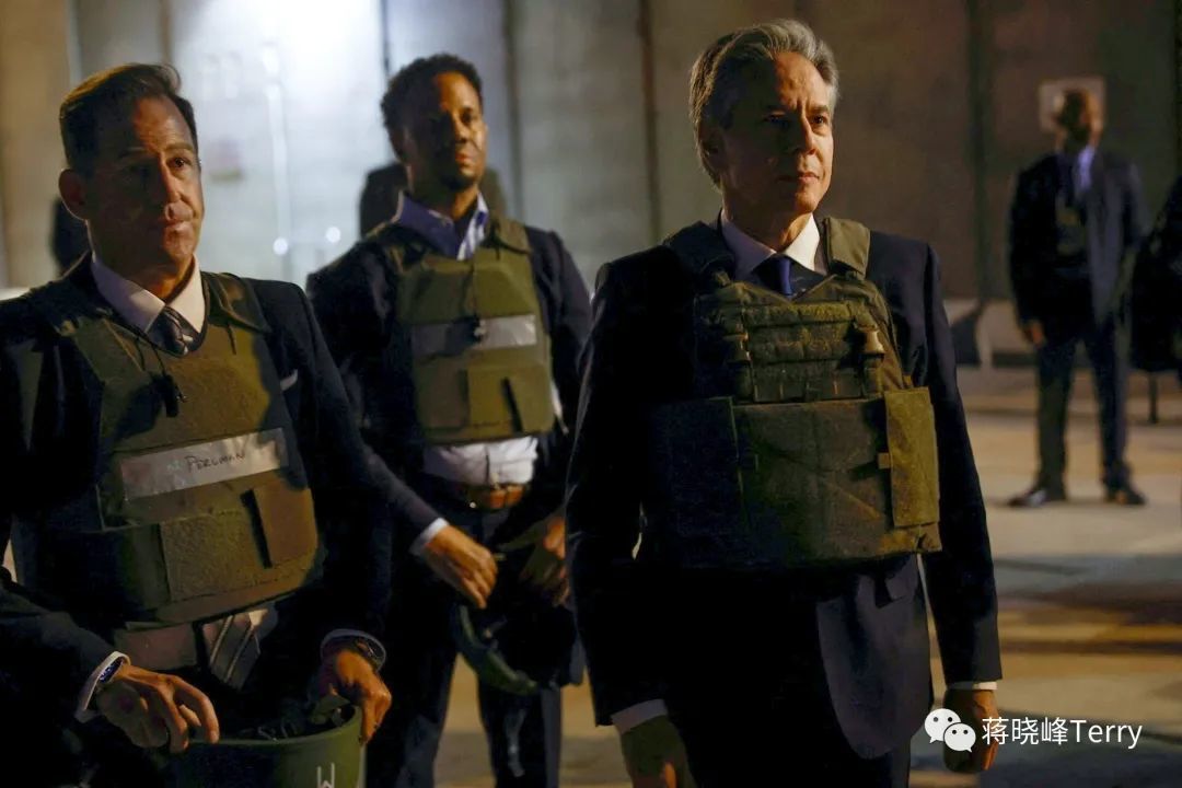 布林肯穿上防弹衣,有同事给他准备了头盔,但他没有戴,应该是怕影响发型。