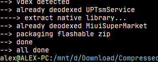Windows 用户双击执行 deploy.bat,macOS / Unix 用户请先在终端内使用 chmod +x deploy.sh 为 deploy.sh 加入执行权限再运行(在 macOS / Unix 上还需要 JDK 以及 Python 2.7),或者使用 sh deploy.sh 运行脚本。经过漫长的等待,屏幕上提示 --> all done 便代表已经提取完毕,这时应该在目录下面能看到一个以 mipay-机型代号-版本号.zip 格式命名的压缩包。