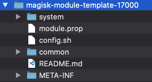 从 这里 下载中文社区提供的 Magisk 模块模板,仍然是采用「Download ZIP」方式来下载。下载完成后将其解压,得到如下图所示的目录结构: