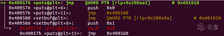 (1)执行put@plt,此时puts函数的GOT表填充的只是下一条指令地址,push reloc_arg=0x0