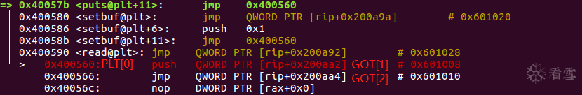 (2)执行puts@plt+11指令,跳转到PLT[0],push GOT[1]的内容,并跳转到GOT[2]上去执行