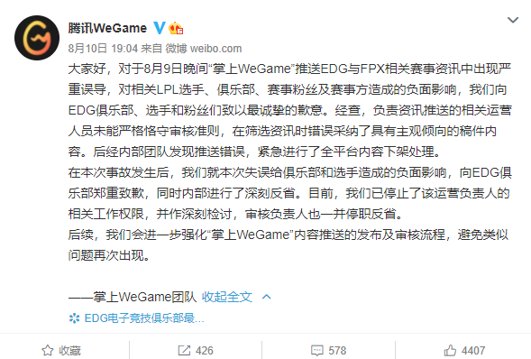IT之家 8 月 11 日消息 Wegame 官博昨日晚间发文,针对”带 EDG 假赛节奏”一事致歉,向 EDG 战队,粉丝,选手道歉。