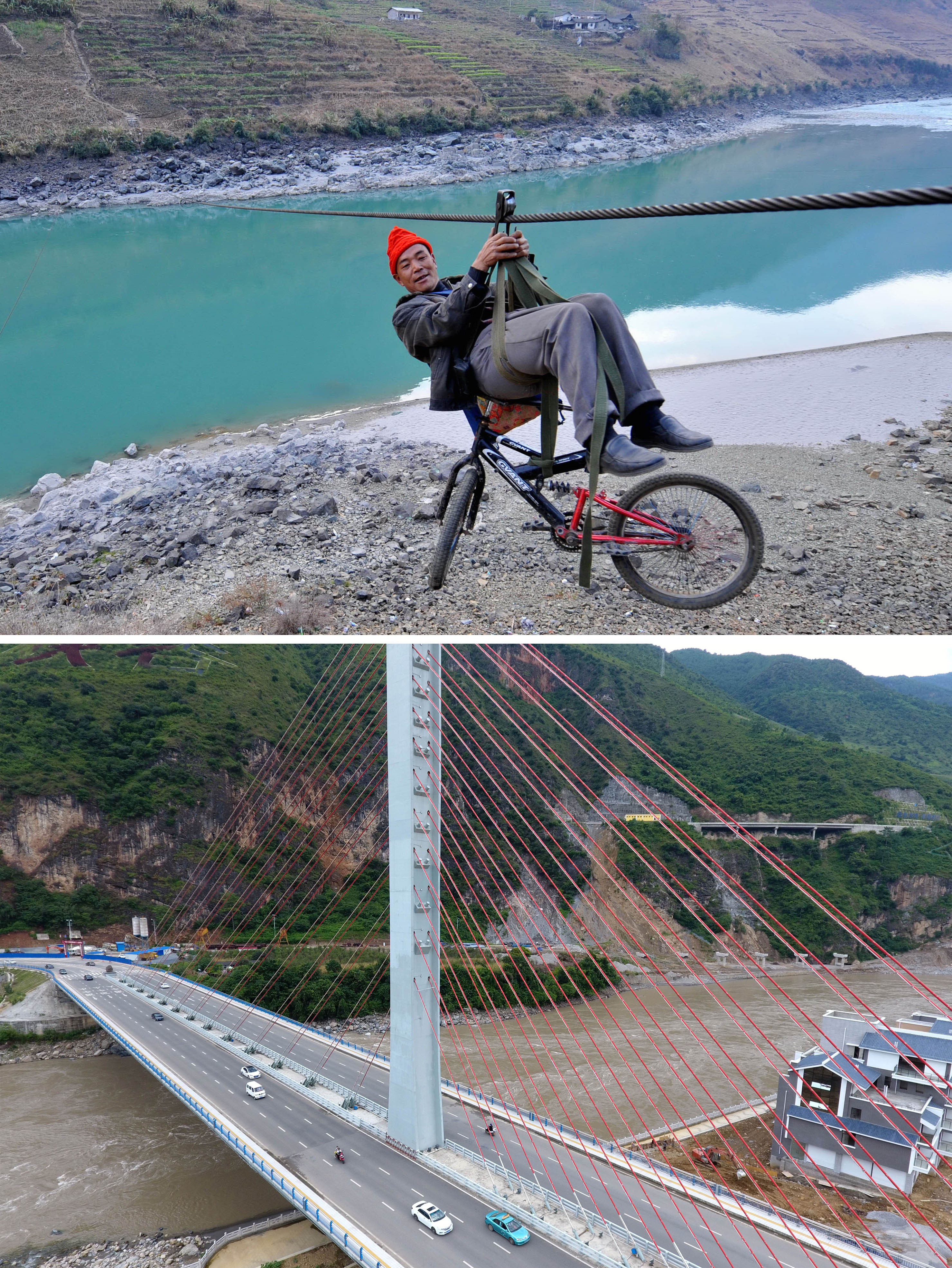 在怒江傈僳族自治州泸水县六库镇双米地村辣子咪村民小组,一名傈僳族男子带着自行车溜索过怒江(新华社记者 蔺以光 摄);下图:2016年9月9日拍摄的怒江傈僳族自治州的双向六车道大型公路跨江桥梁——通达桥(新华社记者 胡超 摄)
