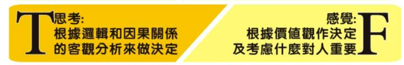 T代表Thinking,它代表了人们通常会基于逻辑和理性做出决定。 T型人更重视的是一件事物的逻辑, 包括事物的起因、发展、结果等等。