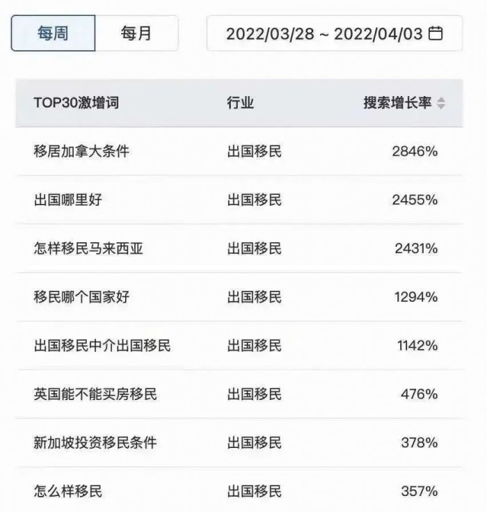 出国移民行业搜索量暴涨,在其中的搜索热词中“移居加拿大条件”排在搜索第一名,增长率高达2846%。“出国哪里好”,增长2455%增长率排在第二名。