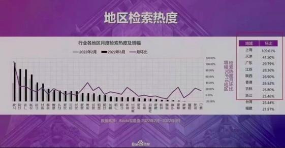 根据百度公布的数据显示,在国内地区检索移民热度方面,排名前十的省市分别为:上海、江苏、广东、北京、山东、浙江、安徽、福建、辽宁、河南。除国内一线城市外,其余二三线城市均有增加,检索热度均为新高。检索移民热度月环比增幅TOP10的地区分别为:上海、天津、广东、江苏、陕西、香港、吉林、浙江、台湾、福建。