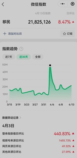 4月3日,上海宣布 “ 严格坚持社会面清零不动摇 ” 后,“ 微信指数 ” 显示,当天关于”移民“话题的整体指数上升 440%,视频相关来源也暴增 1455%。微信话题单日搜索量达到了惊人的近 5,000 万次,相当于每 20 个微信用户中,就有 1 个在 4 月 3 日当天搜索了“移民”。