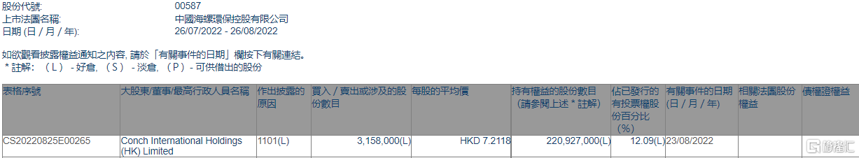 格隆汇8月26日丨根据联交所最新权益披露资料显示,2022年8月23日,海螺环保(00587.HK)获Conch International Holdings (HK) Limited在场内以每股均价7.2118港元增持315.8万股,涉资约2277.5万港元。