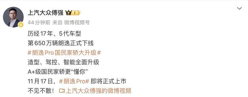 易车讯 我们从上汽大众官方获悉,朗逸Pro车型今日正式下线,新车也是朗逸家族第650万辆量产车,具有里程碑意义。上汽大众汽车有限公司销售与市场执行副总经理傅强在社交媒体上表示,朗逸Pro将于11月17日上市。