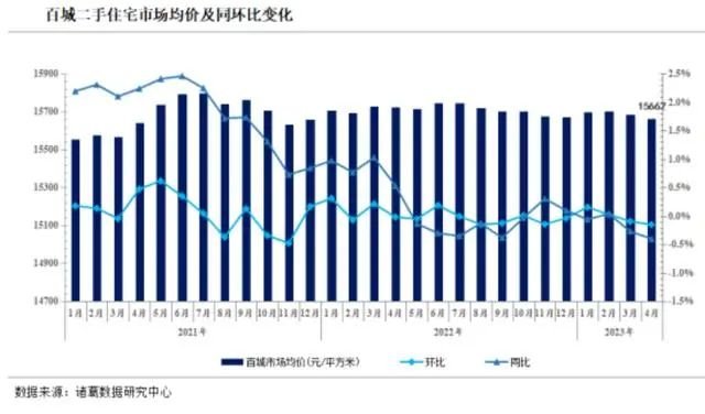 一份诸葛数据研究中心监测数据显示,4月100个重点城市二手住宅市场均价为15662元/平方米,环比下降0.15%、同比下降0.4%