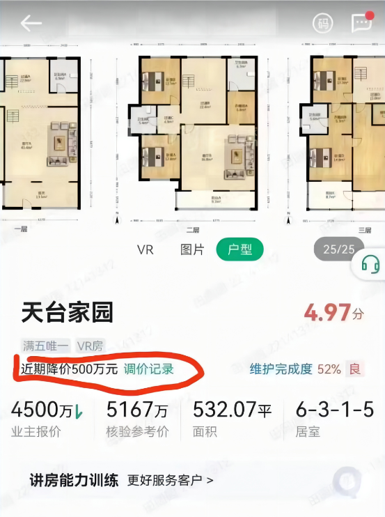 就比如前面降价500万的,虽然总房价高达4500万,但500万的降幅算起来也达到近11%,房东也是个狠人