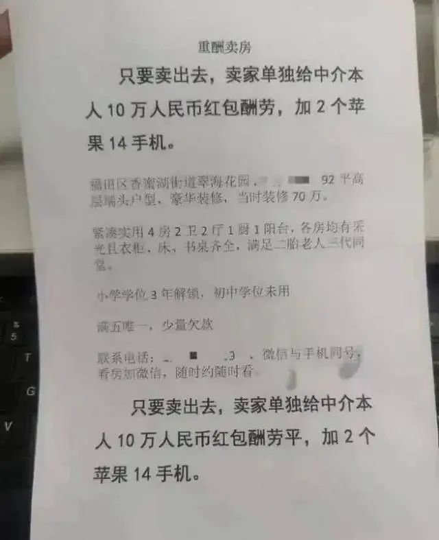 只要房子卖出去了,业主直接奖励中介10万人民币红包酬劳,外加2部苹果14手机