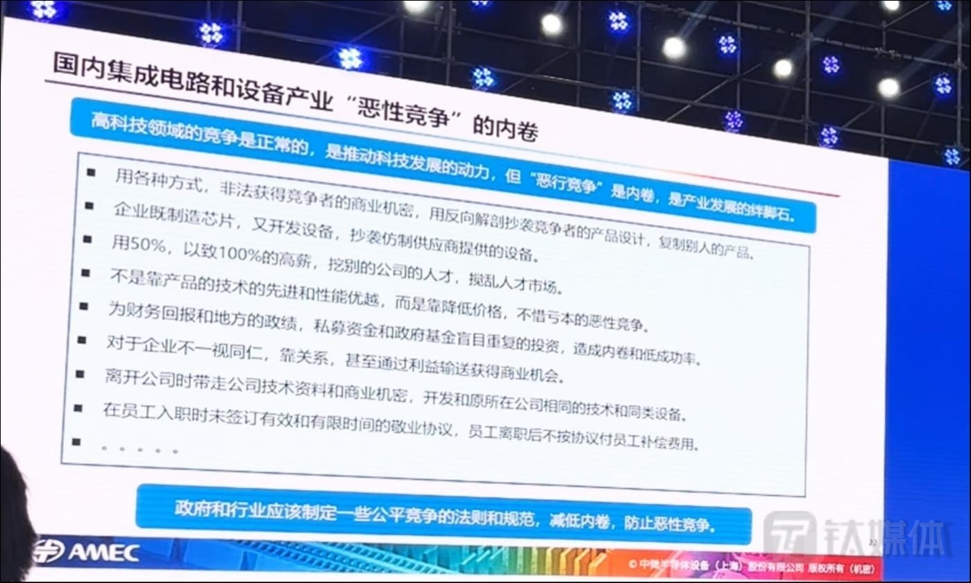 “用各种方式,非法获得竞争者的商业机密,用反向解剖抄袭竞争者的产品设计,复制别人的产品;企业既制造芯片,又开发设备,抄袭仿制供应商提供的设备;用50%,以致100%的高薪,挖别的公司的人才,搅乱人才市场;不是靠产品的技术的先进和性能优越,而是靠降低价格,不惜亏本的恶性竞争;为财务回报和政绩,私募资金和城投基金盲目重复的投资,造成内卷和低成功率;离开公司时带走公司技术资料和商业机密,开发和原所在公司相同的技术和同类设备等。”尹志尧表示。